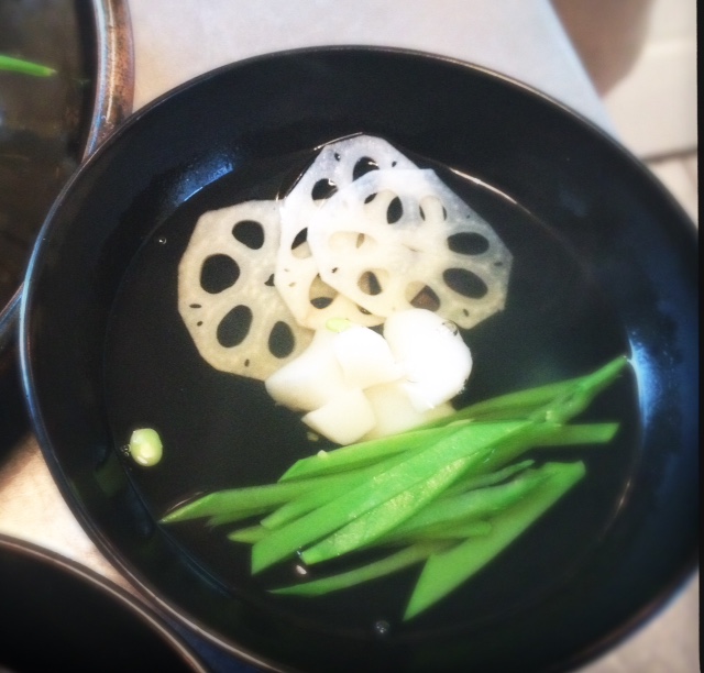This is “sumashi-jiru” (clear soup). Today, I made this soup with snow peas, lotus roots and scallops. This looks quite simple but this requires time, dedication, and love. This soup is packed with umami. I did not have to add gobs of condiments, I only added tiny bit of salt and just a splash of shoyu (soy sauce). It took about 90 minutes total to prepare this soup.